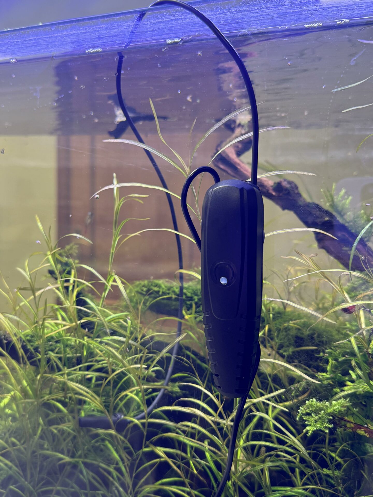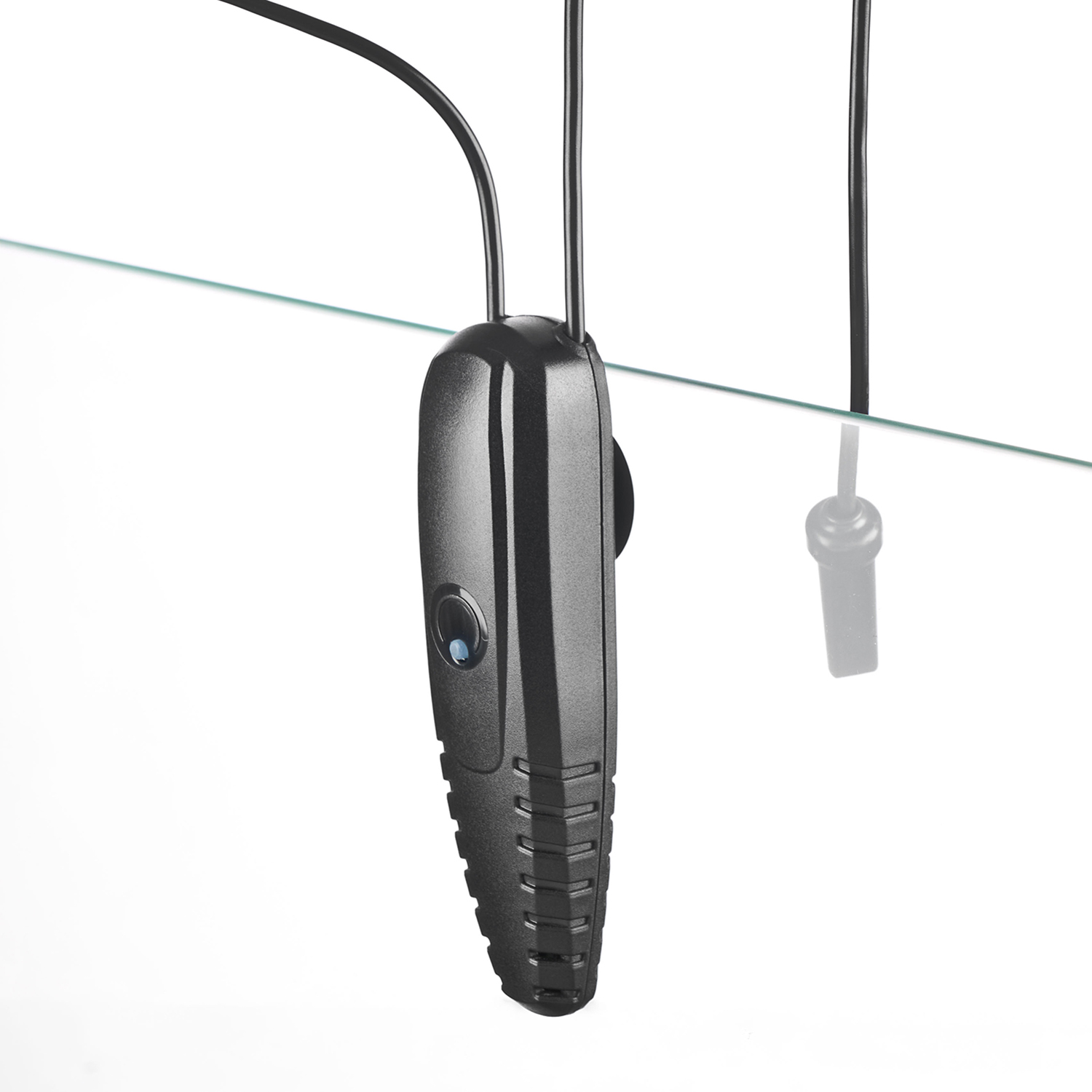 Kompaktní jednotka (11,4 × 3,0 cm) se pevně připevňuje na sklo pomocí silné přísavky. Černá barva nenápadně splývá s pozadím a neruší podvodní aranžmá. Teploměr je napájen přes USB-C, což umožňuje flexibilní volbu zdroje energie.