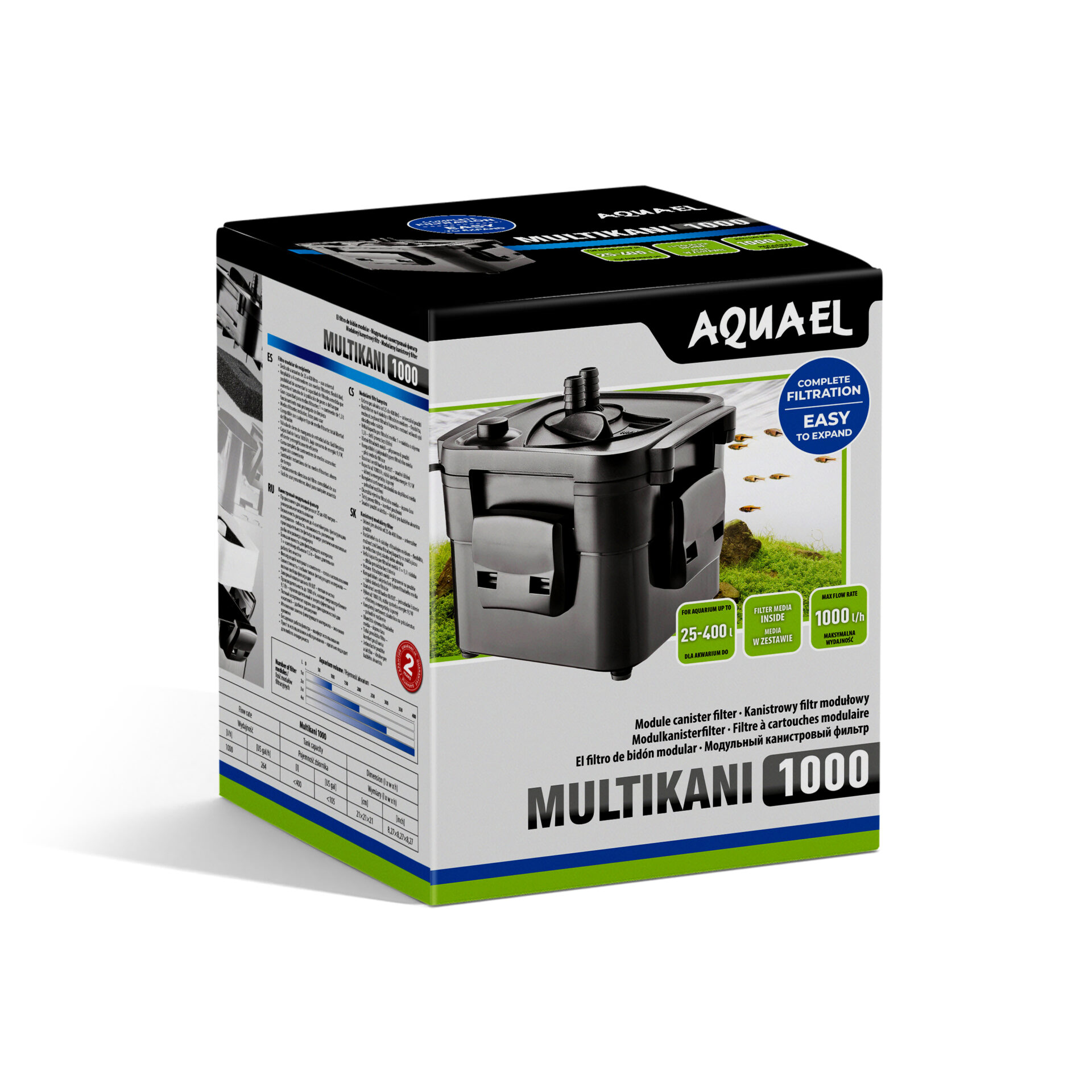 Multikani 1000 poskytuje spolehlivou filtraci, kterou lze rozšiřovat podle toho, jak vaše akvárium roste. Hlavní modul lze doplnit až o 3 další filtrační komory, čímž se výrazně zvětší objem filtračních médií. Filtr je vhodný pro sladkovodní akvária o objemu 25 až 400 litrů.