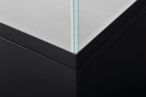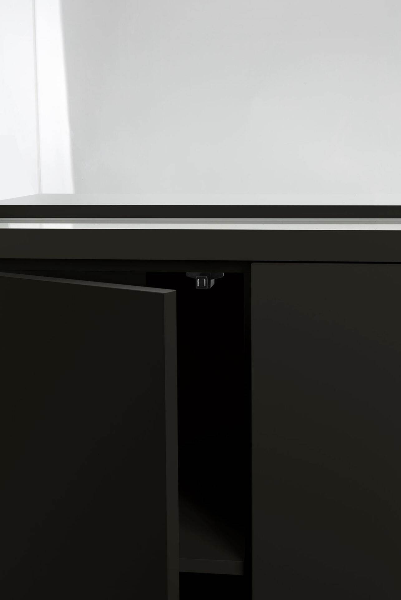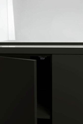 The cabinet door aligned with the aquarium adds elegance and creates the impression of a uniform body. With this effect in mind, the door can also be opened by touch, without the use of traditional handles. A handy shelf for accessories is hidden behind the door.